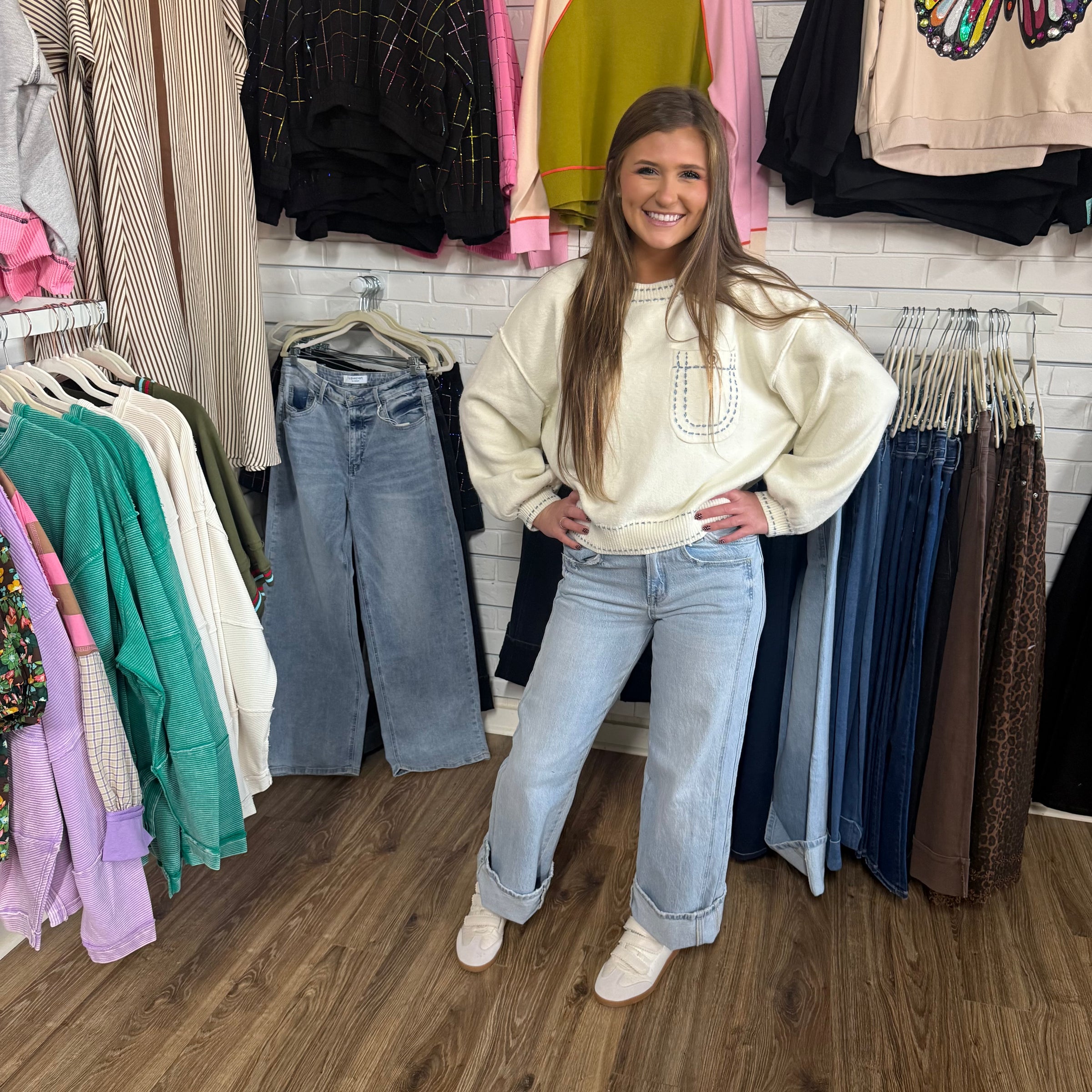 Solid long sleeve sweater knit top featuring contrast blanket stitch accents and front chest pocket with button. Unlined. Knit. Non-sheer. Medium weight.