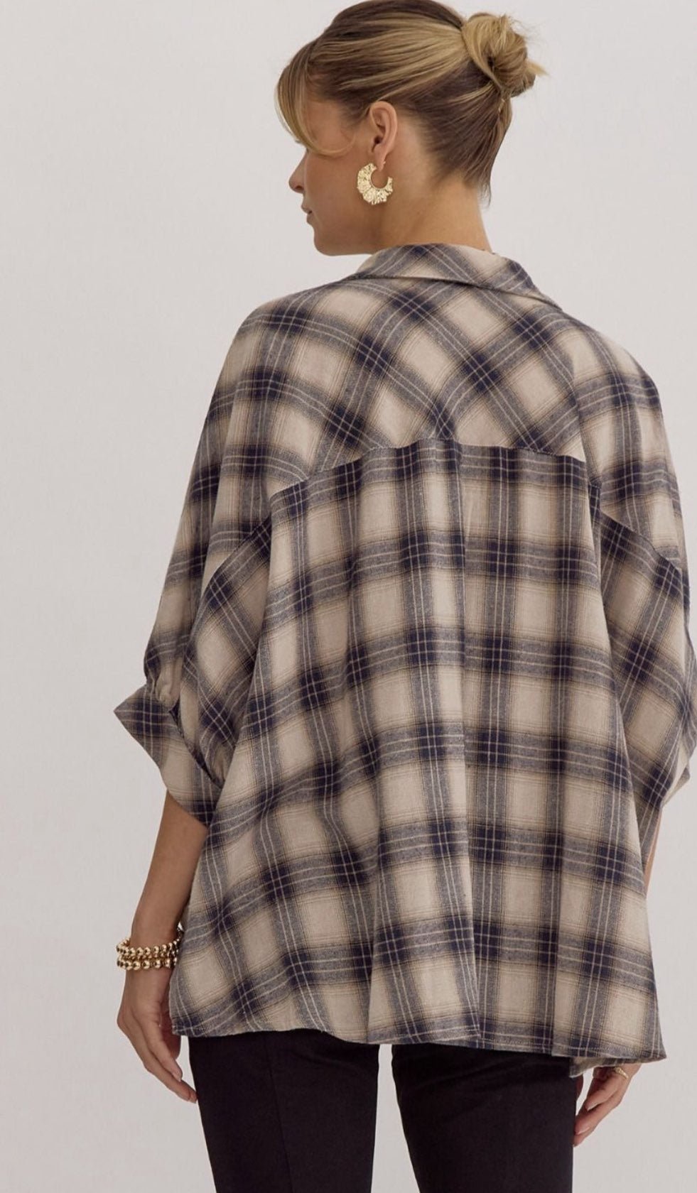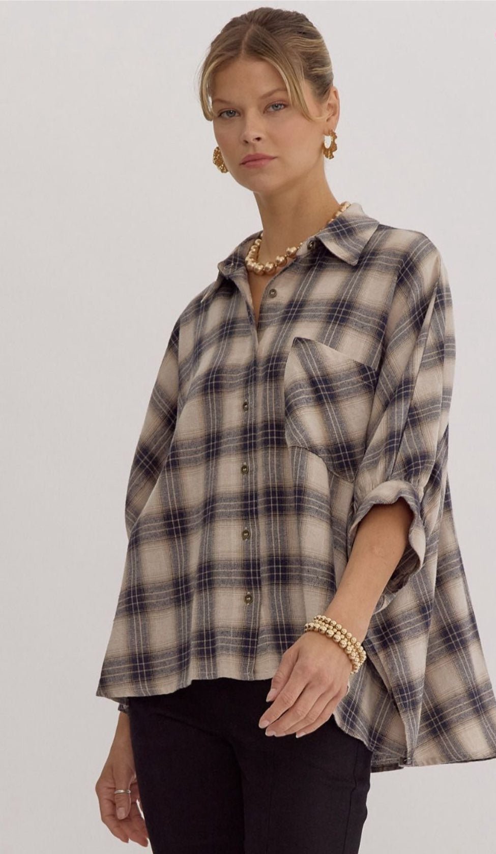 TAUPE PLAID SHORT SLV BUTTON TOP