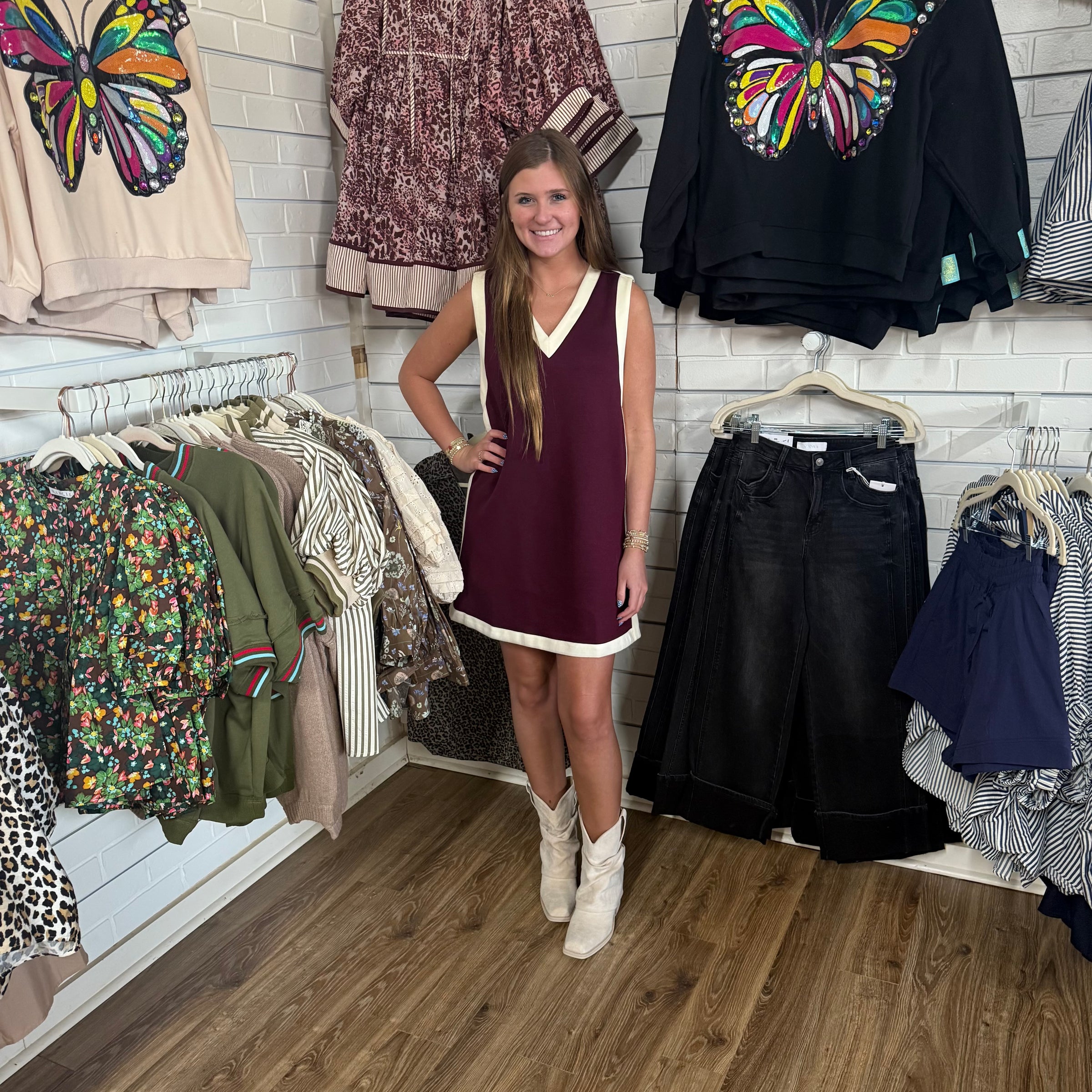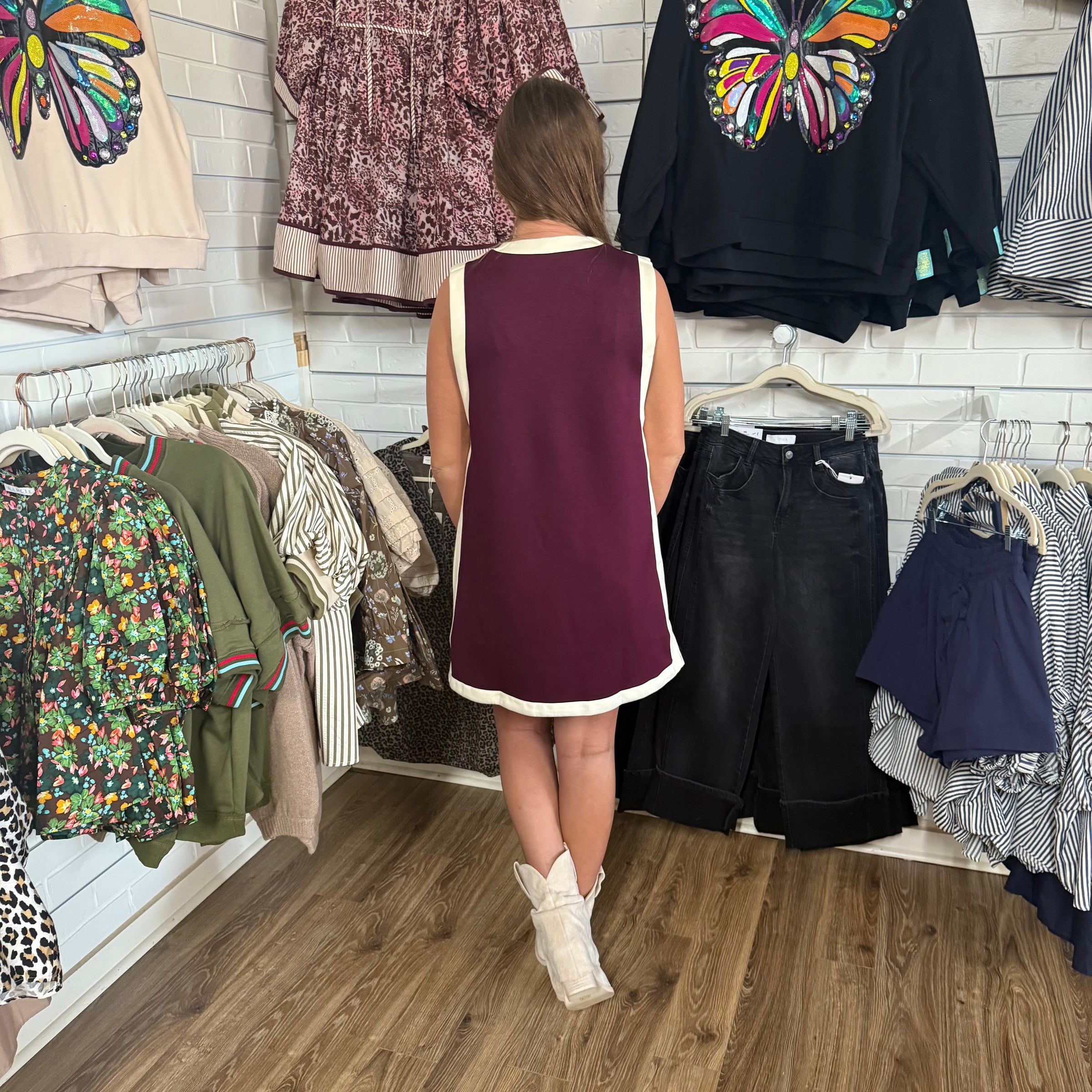 Solid sleeveless pullover varsity-inspired mini pullover dress featuring contrast band detailing. Unlined. Knit. Non-sheer. Lightweight.