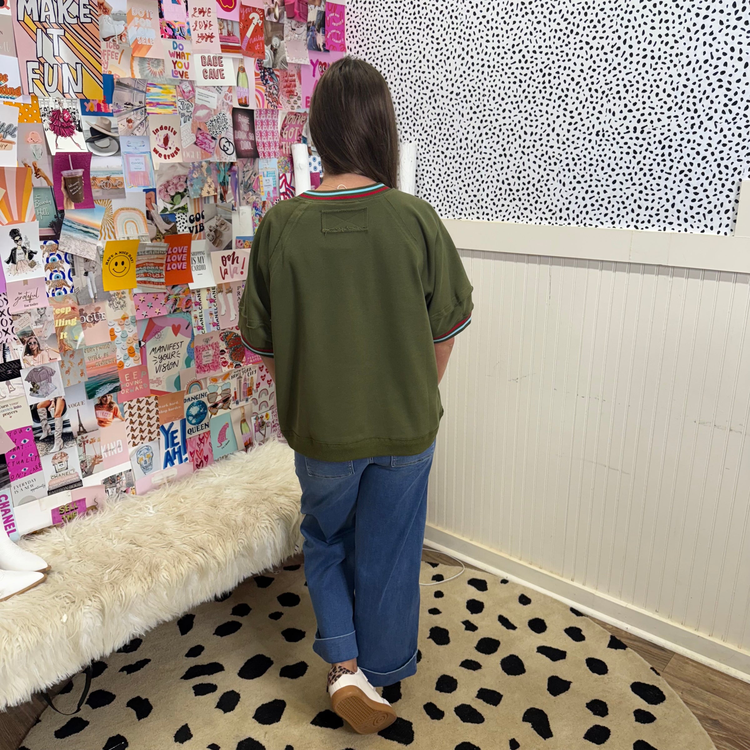 Solid elbow-length raglan sleeve pullover knit top featuring multicolor band accent. Unlined. Knit. Non-sheer. Lightweight.