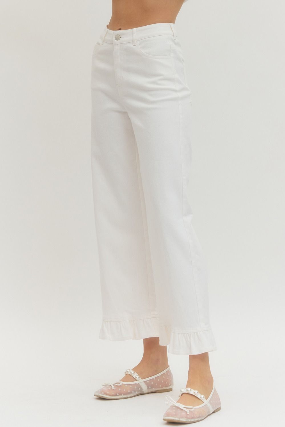 Solid wide leg pants featuring ruffle hem. Zip fly button closure. Side and back pockets. Unlined. Woven. Non-sheer. Lightweight.