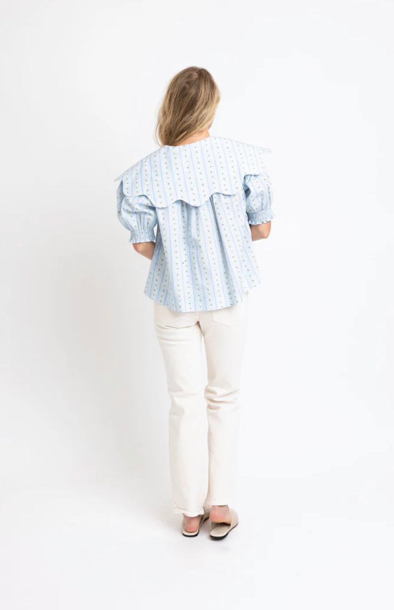 BLUE FLORAL STRIPE COLLAR BUTTON TOP