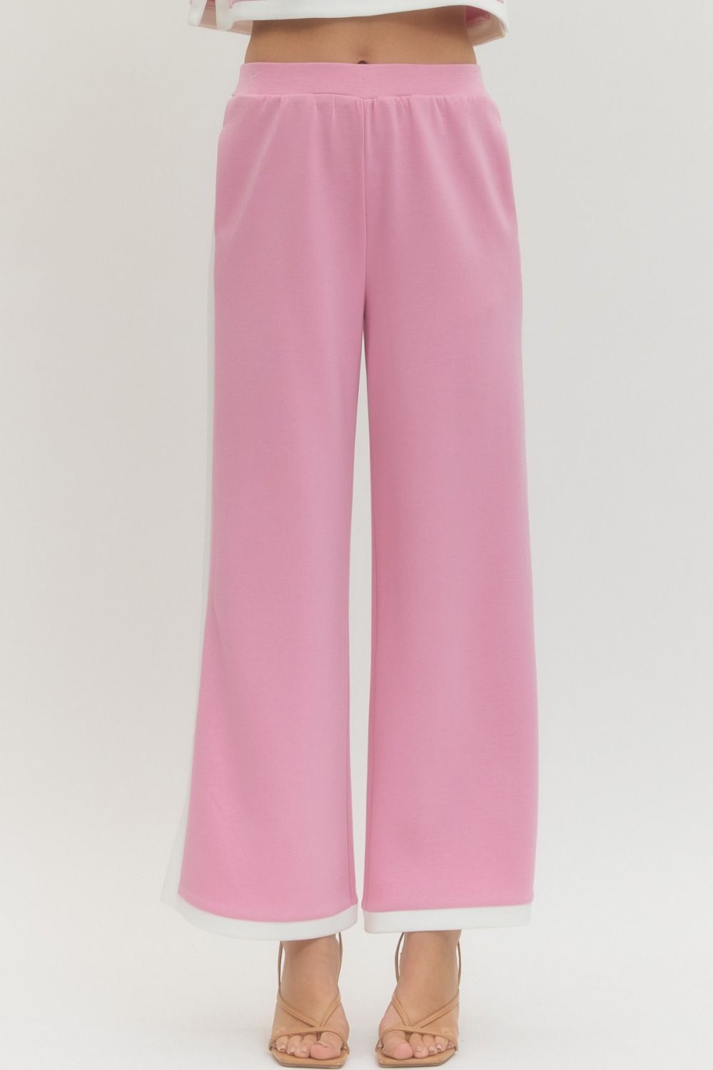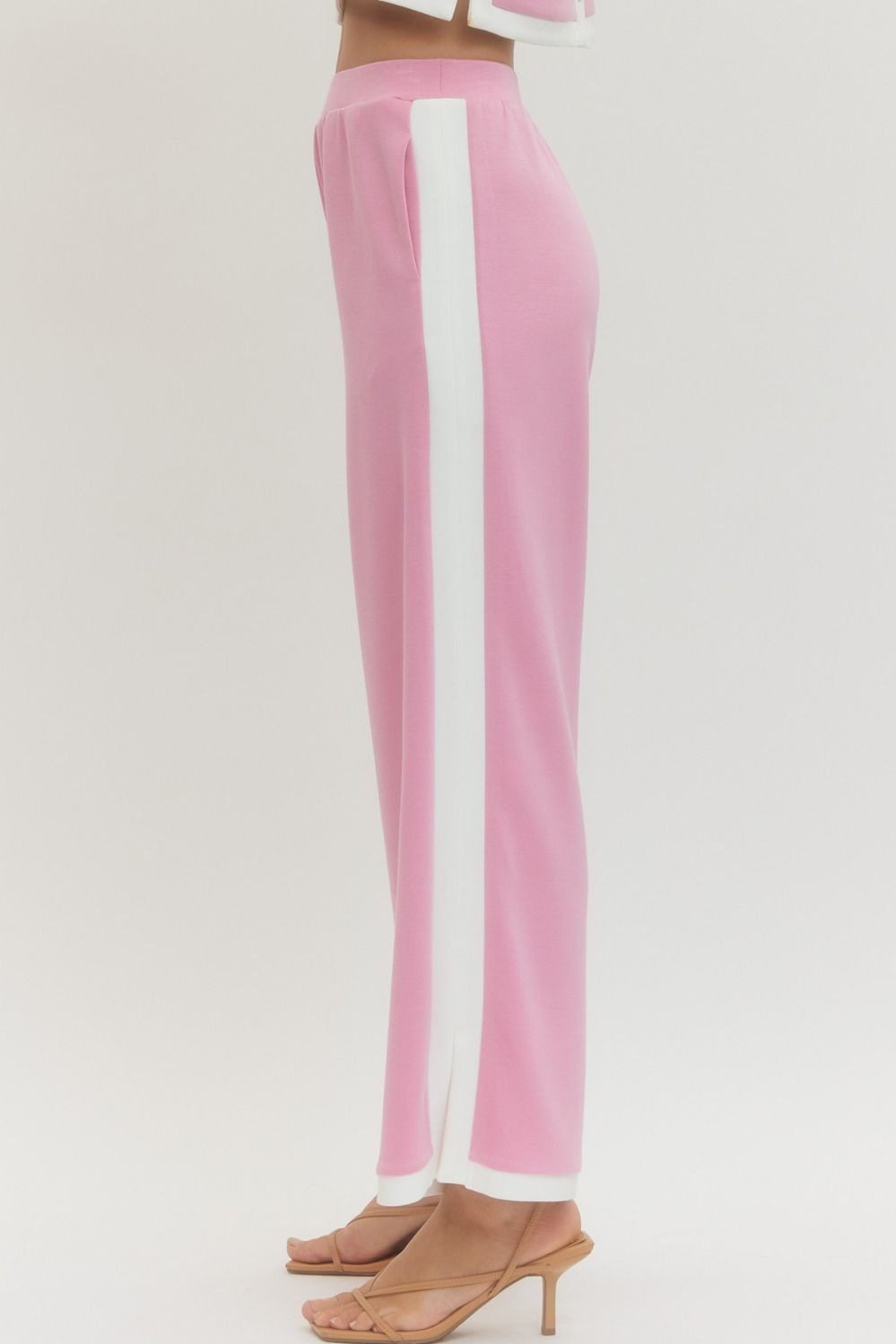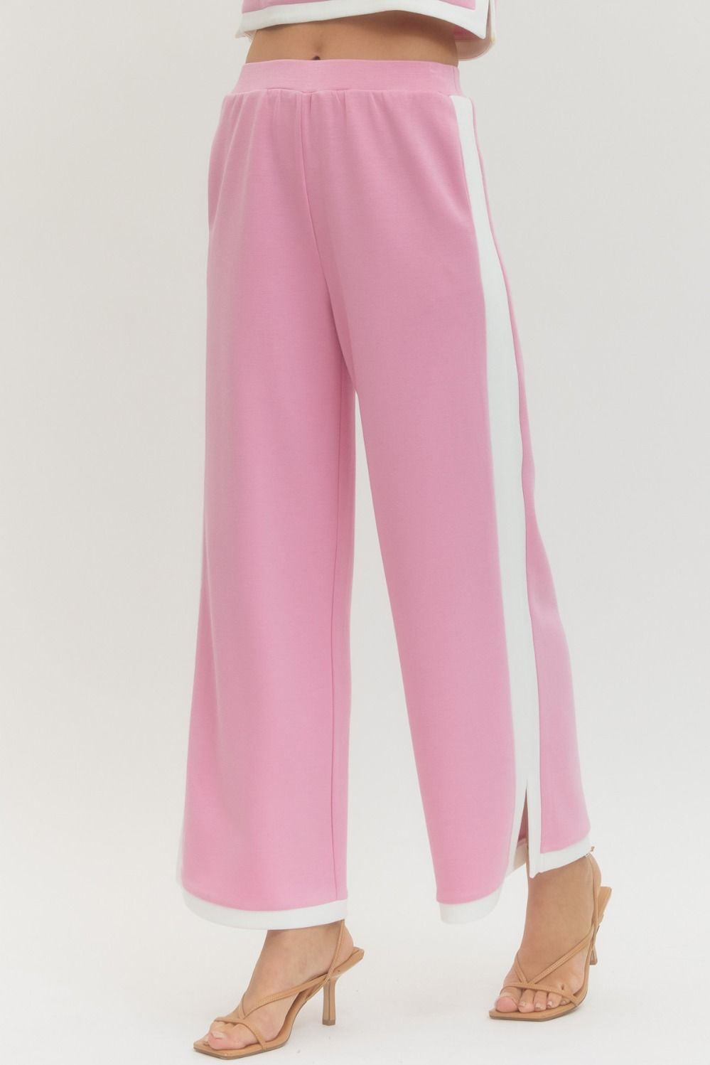 Solid wide leg knit pants featuring elastic waistband with drawstring. Contrast stripe detail at sides with slit hem. Side pockets. Unlined. Knit. Non-sheer. Lightweight.