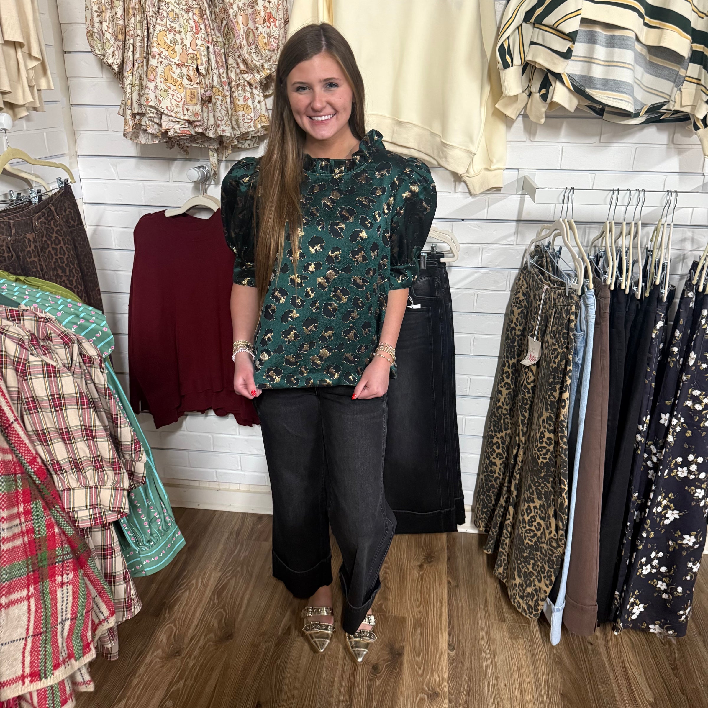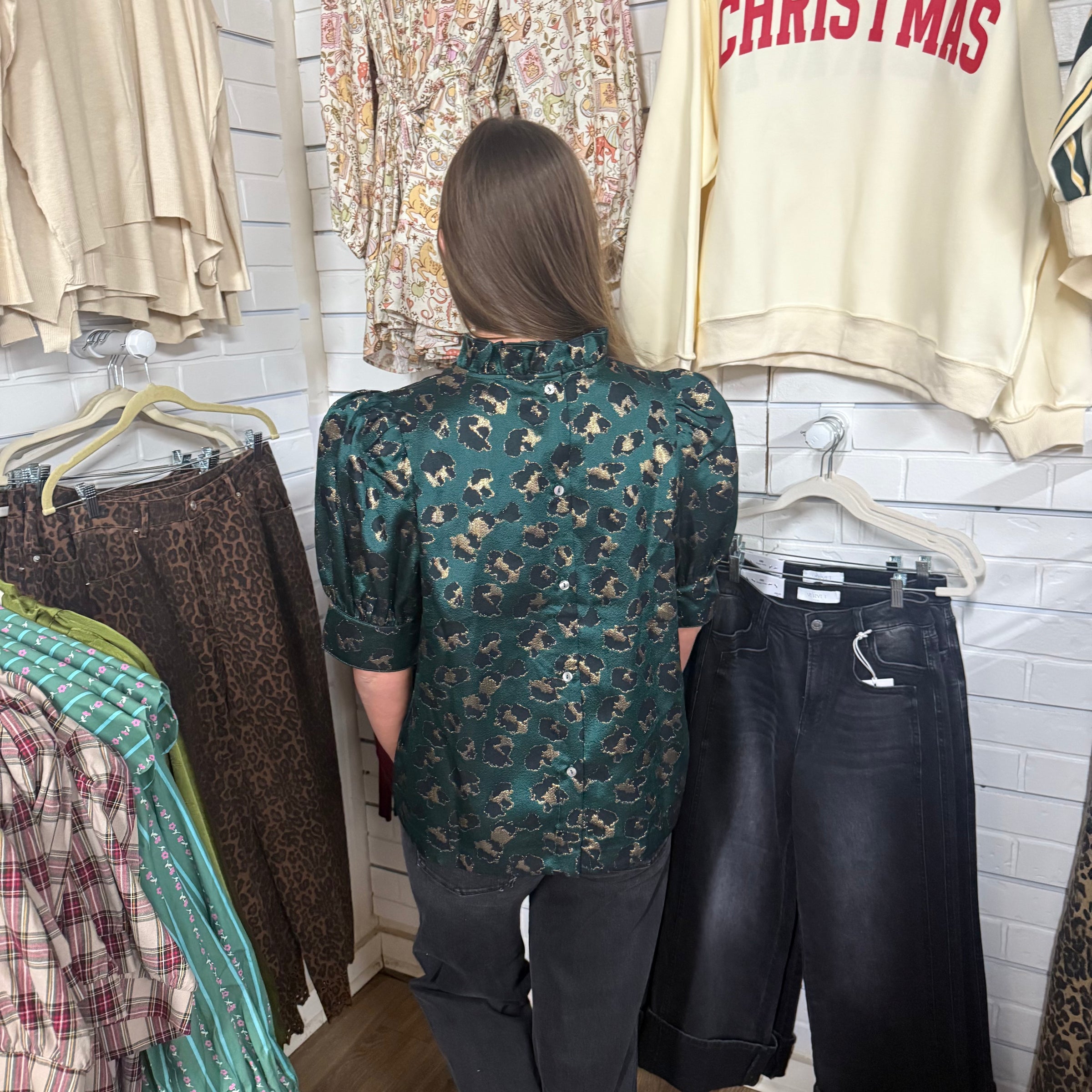 Effortlessly elevate your style with our Green and Gold Leopard Button Back Puff SLV top. The small ruffle neckline and puff cuff short sleeves add a touch of femininity, while the buttons down the back make for a unique and flattering detail. The gold and pink animal print gives a bold and trendy look to any outfit.