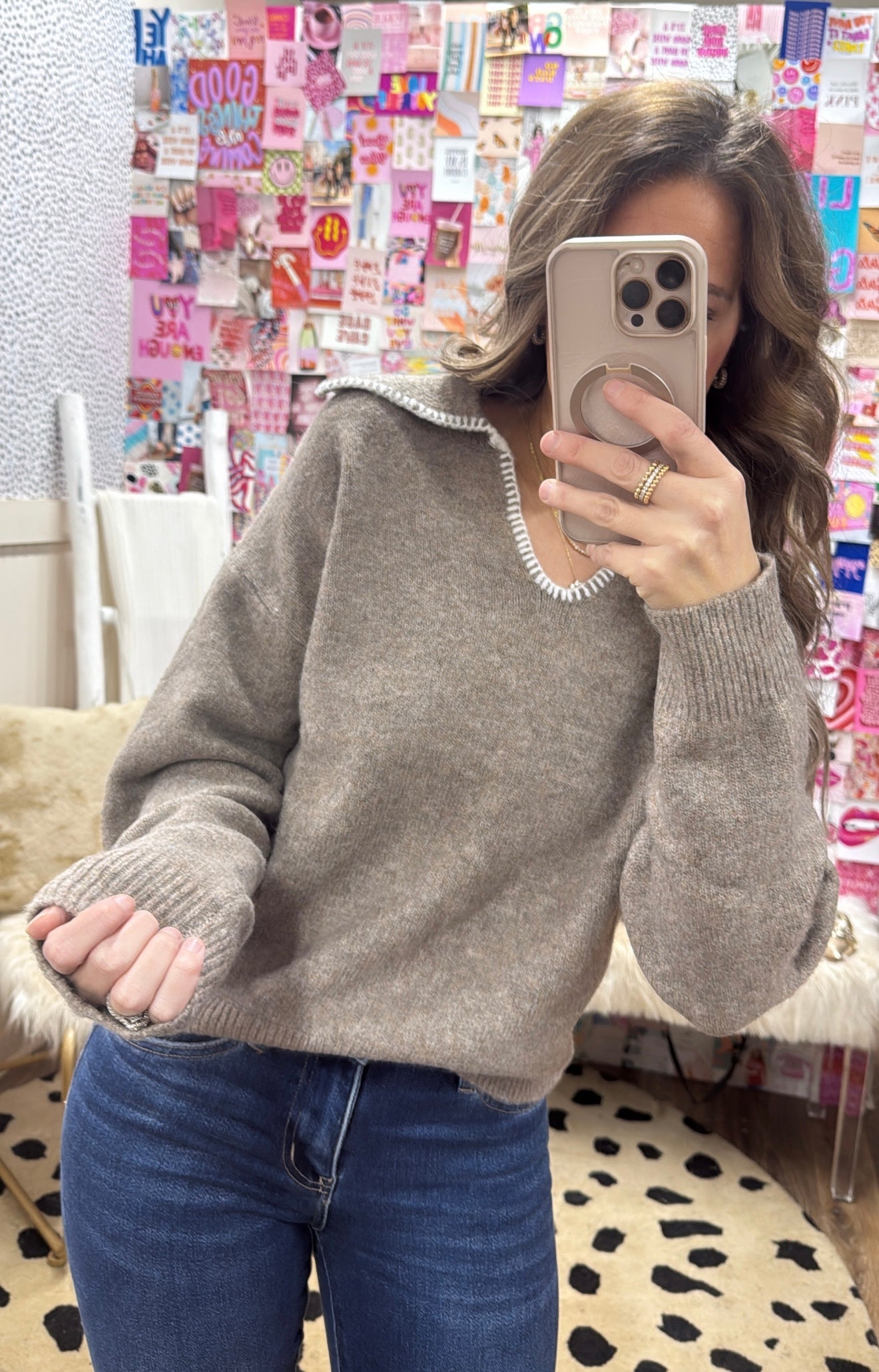 Elevate casual looks with this collared V-neck knit sweater top, designed in a relaxed fit with subtle ribbed edges. The soft knit fabric ensures comfort, while the wide collar adds a touch of polish. Perfect for layering with denim or wide-leg trousers, this versatile piece balances cozy ease and modern style - ideal for boutique buyers seeking refined everyday essentials. Model is wearing Small Height: 5'10" Bust : 34 Waist : 25” Hips : 35”